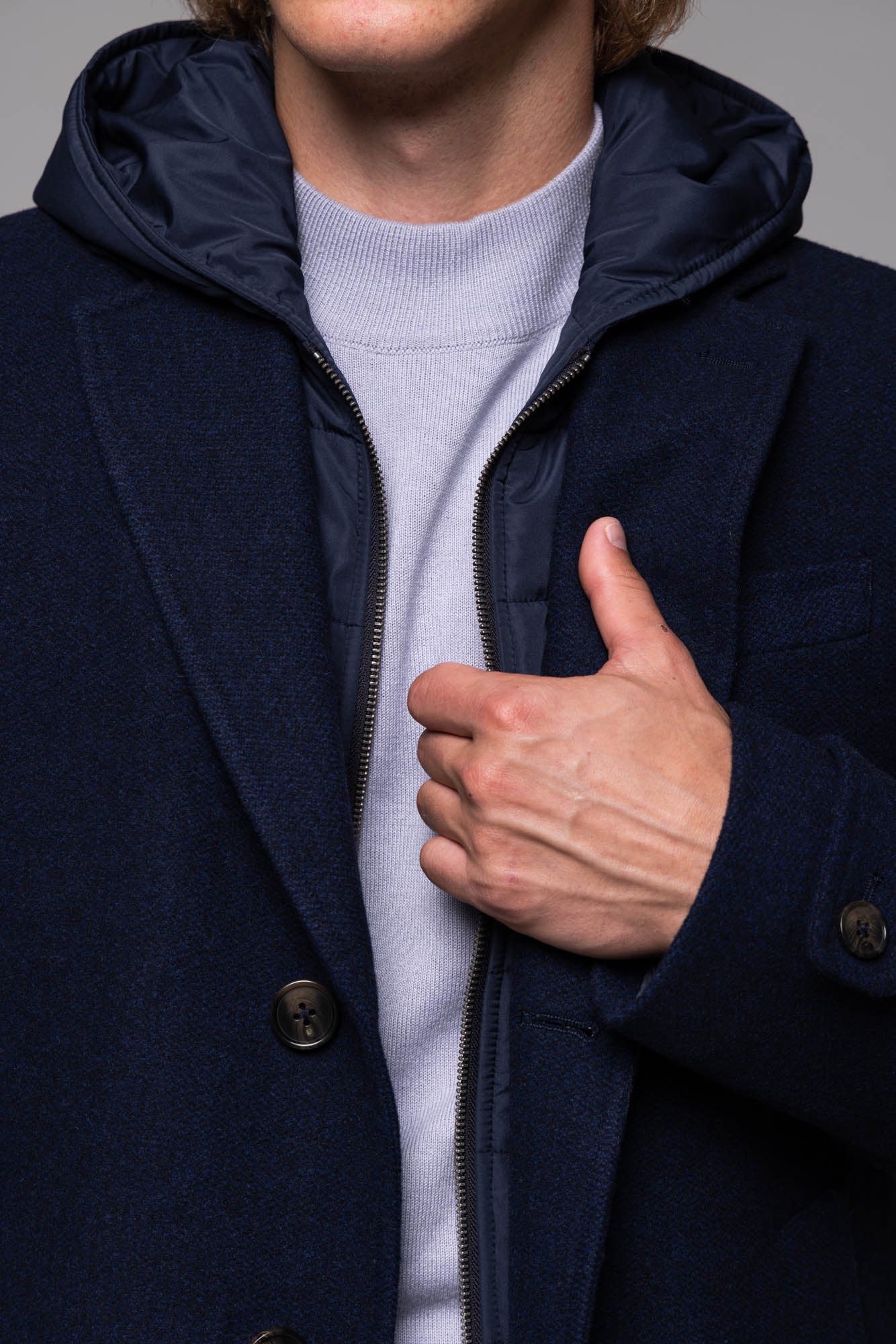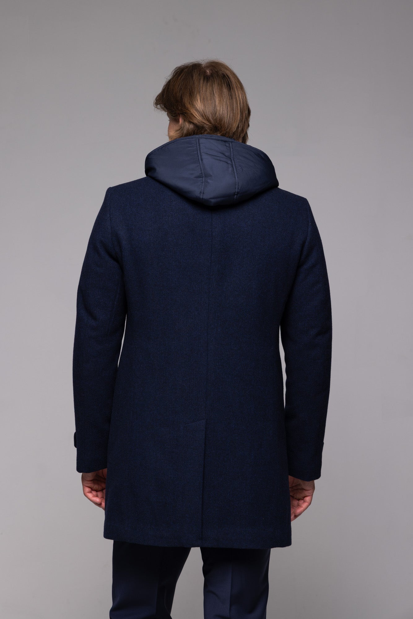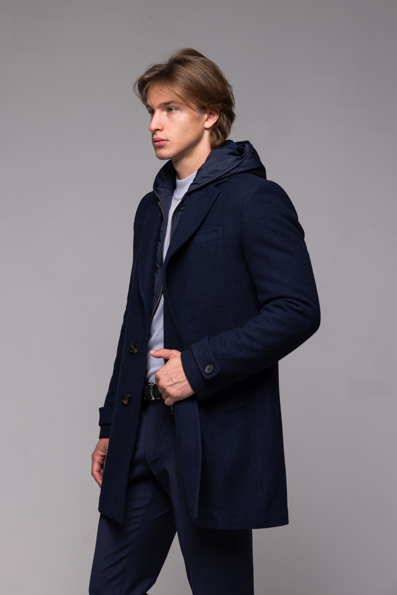 Tmavomodrý vlnený kabát s odnímateľnou vsadkou a kapucňou