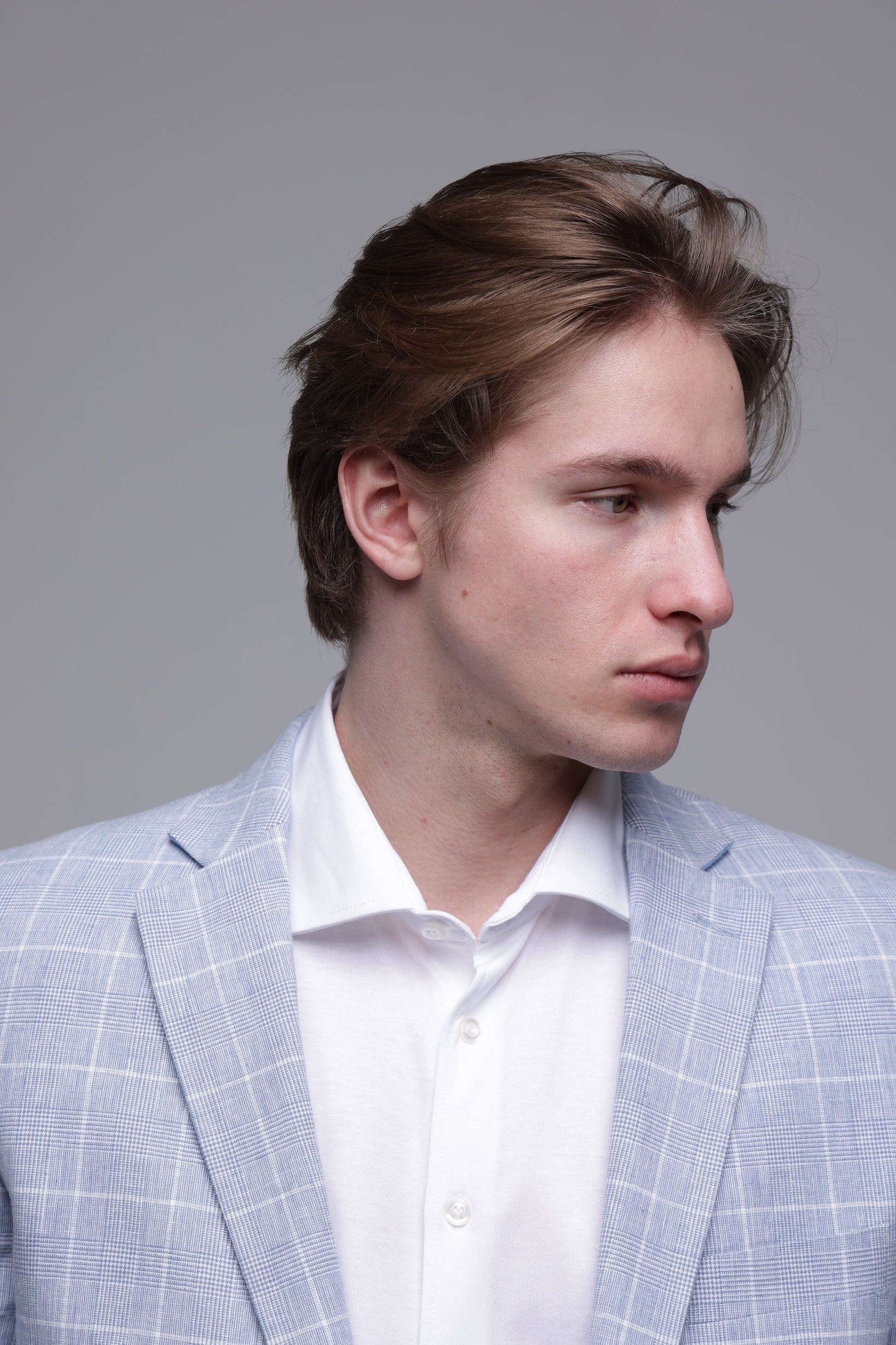 Bledomodré ľanové Slim Fit sako s bielym károm